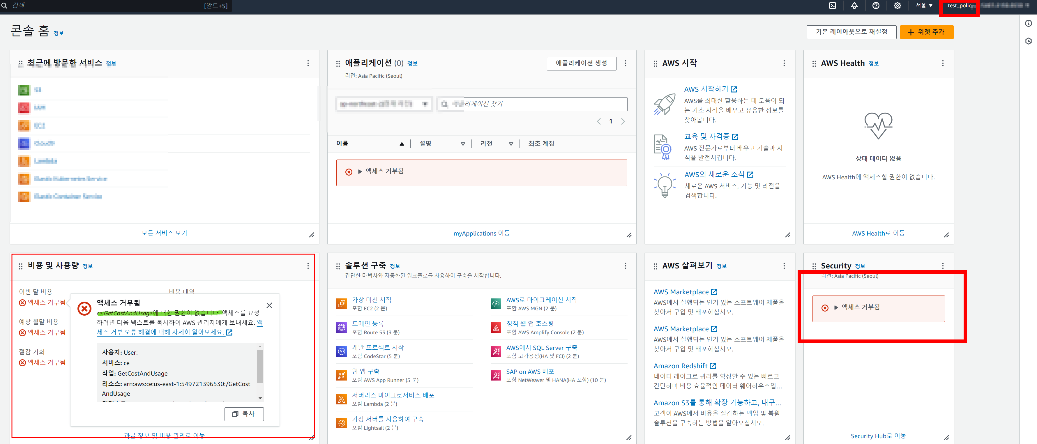비용 및 사용량에서도 엑세스가 거부되었고, 권한이 없다고 에러메세지가 뜨는 것을 확인 할 수 있다.