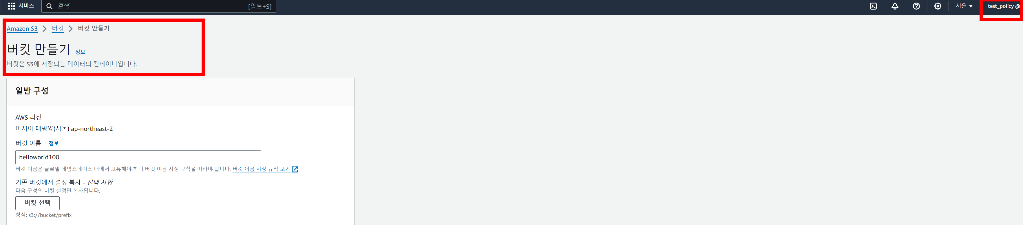 다시 test_policy로 접속해서 S3를 만들어보려한다.