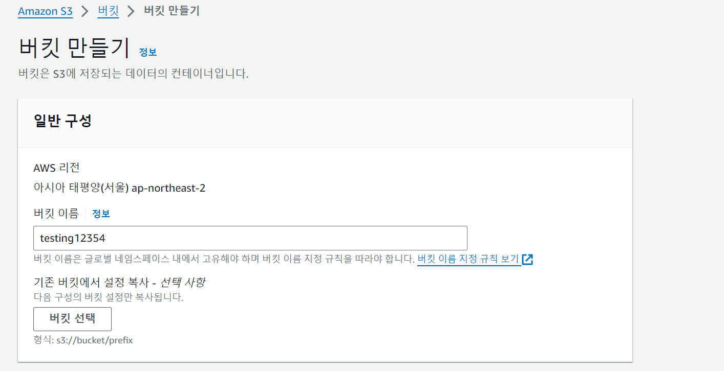 S3 버킷을 만들어보겠다. (물론 당연히 생성은 안되곘지만 안되는 과정을 남기기 위해서이다.)
