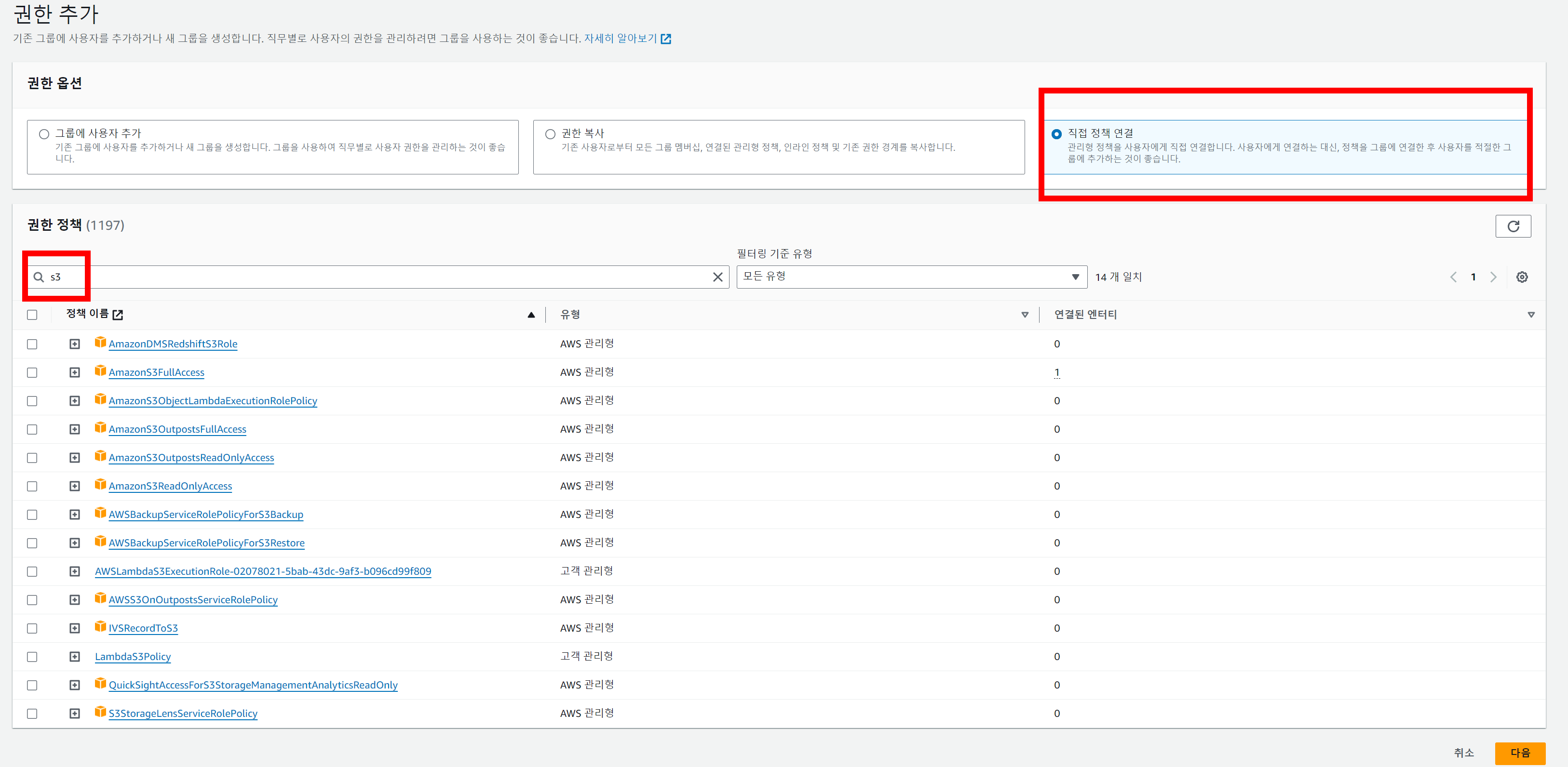 직접 정책 연결을 누르고 s3 로 검색을 하면 s3와 관련 된 정책이 나온다.