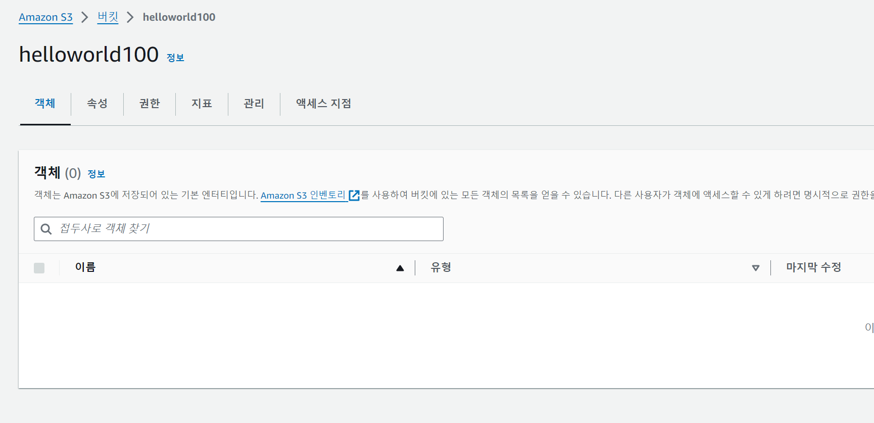 helloworld100 이라는 버킷이 생성 된 것을 확인할 수 있다!