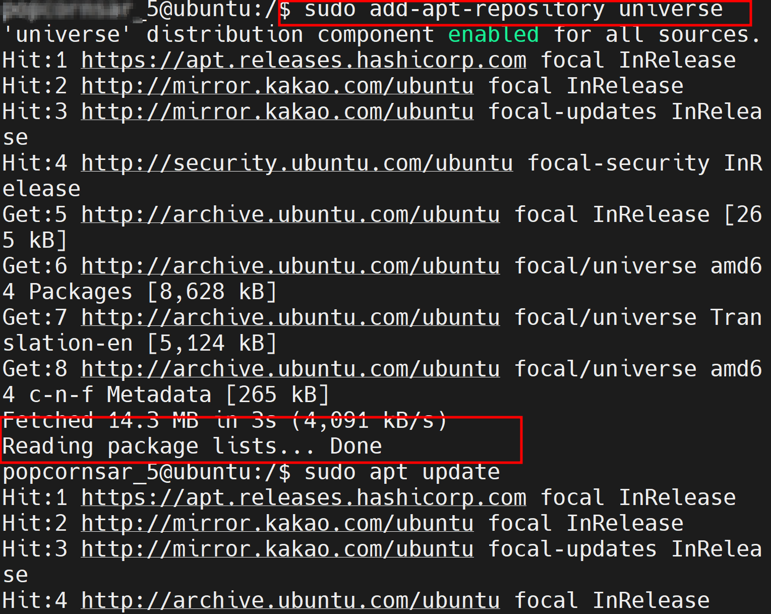 - 명령어 실행 시, 시스템의 /etc/apt/sources.list 파일 또는 /etc/apt/sources.list.d/ 디렉토리에 적절한 소스 리스트 파일을 생성하거나 수정하여 universe 리포지토리의 URL을 추가합니다.
