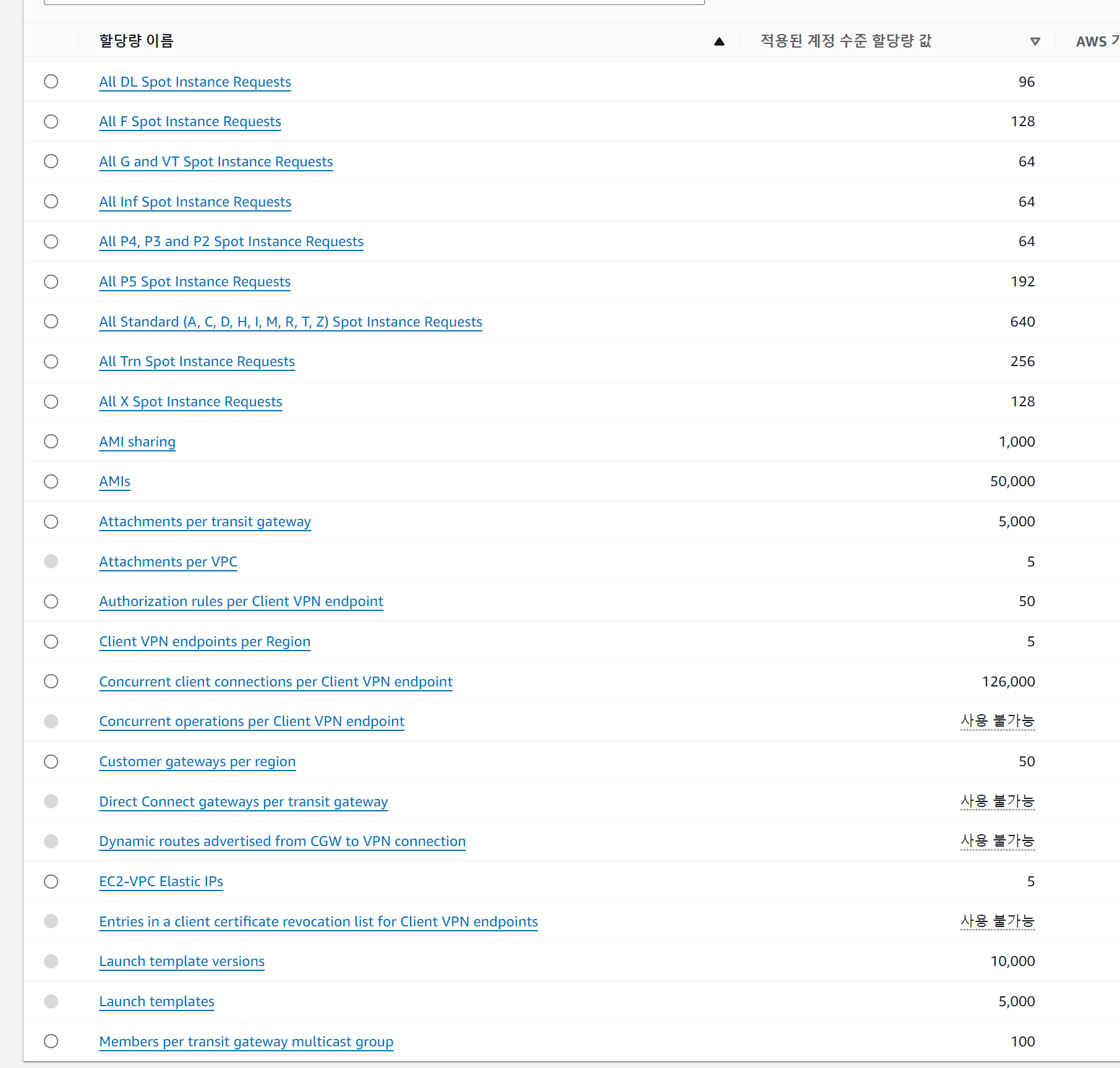 - 가변 할당량(Adjustable Quotas): 이 할당량은 AWS 지원팀에 요청하여 늘릴 수 있다. 예를 들어, EC2 인스턴스 수, ELB 수, VPC 수 등이 이에 해당.