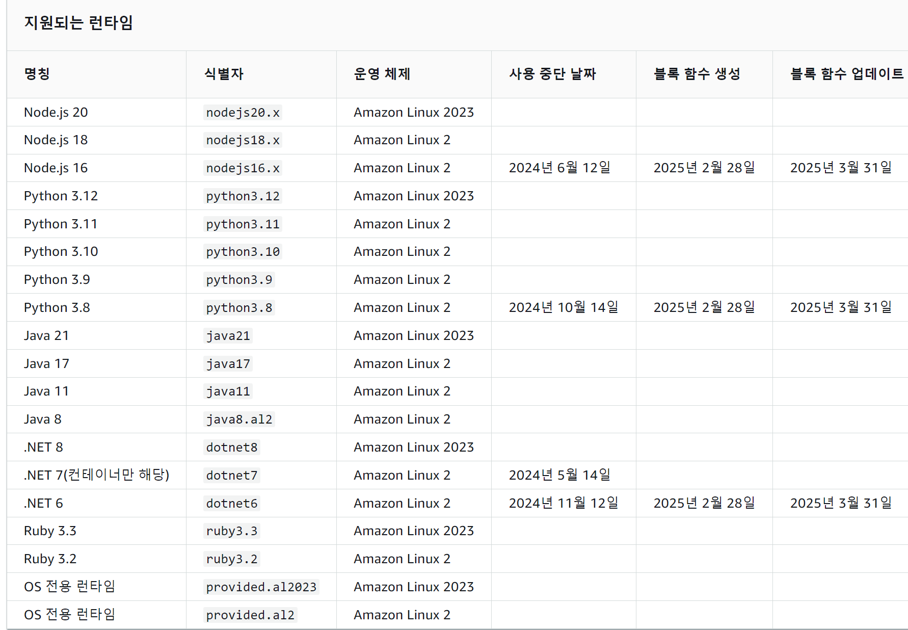 Lambda는 때때로 해당 런타임이 지원하는 언어 버전의 지원 종료일 이후 제한된 기간 동안 Lambda 런타임의 지원 중단을 지연합니다. 이 기간 동안 Lambda는 런타임 OS에만 보안 패치를 적용합니다. Lam
