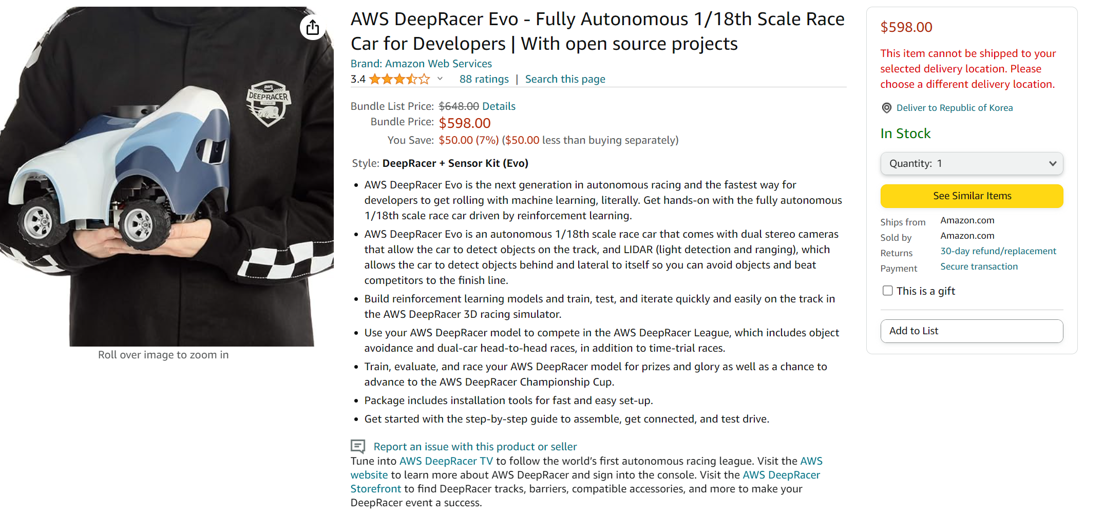 실물 자동차는 위 그림과 같다. 추가 키트(evo - 라이다 센서 등 추가 포함)가 나왔으며, amazon 사이트에서 deepracer로 검색하면 주문이 가능하다.(링크)(현지 경유 해외 배송과 통관이라는 절차를 거쳐야하겠지만, evo를 합치면 가격은 거의 $600정도 한다.)