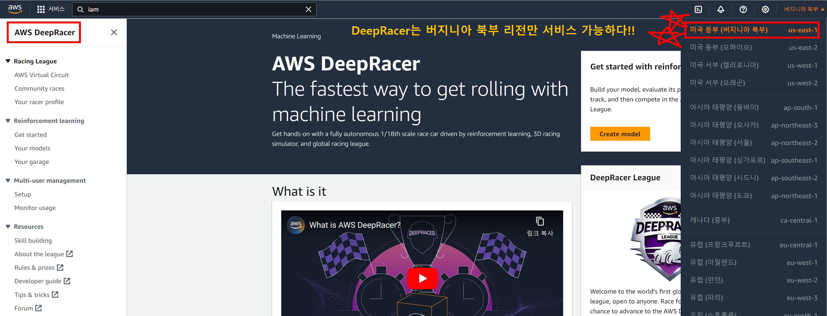 AWS DeepRacer 서비스는 버지니아 북부(us-east-1) 리전에서만 가능하다!
