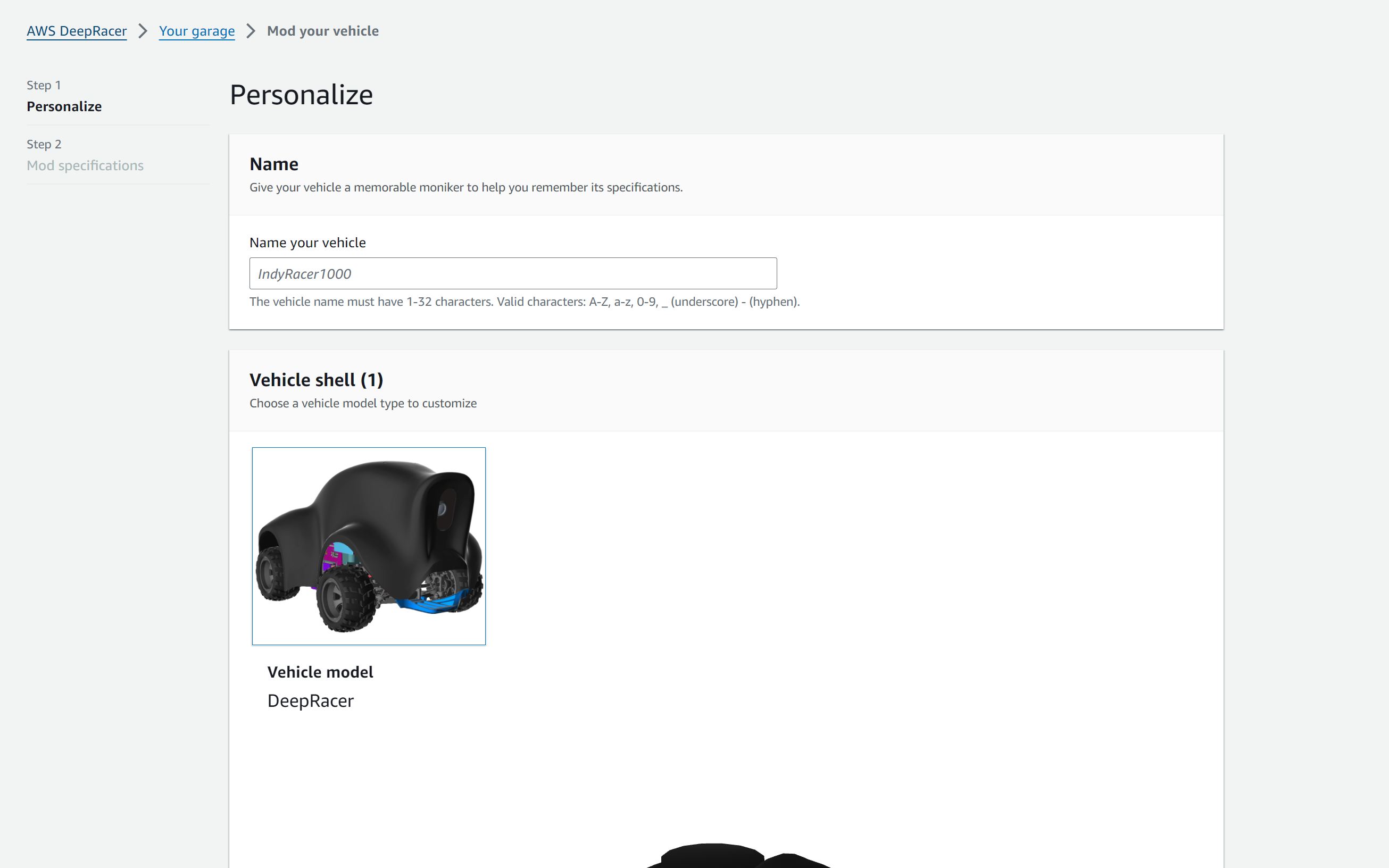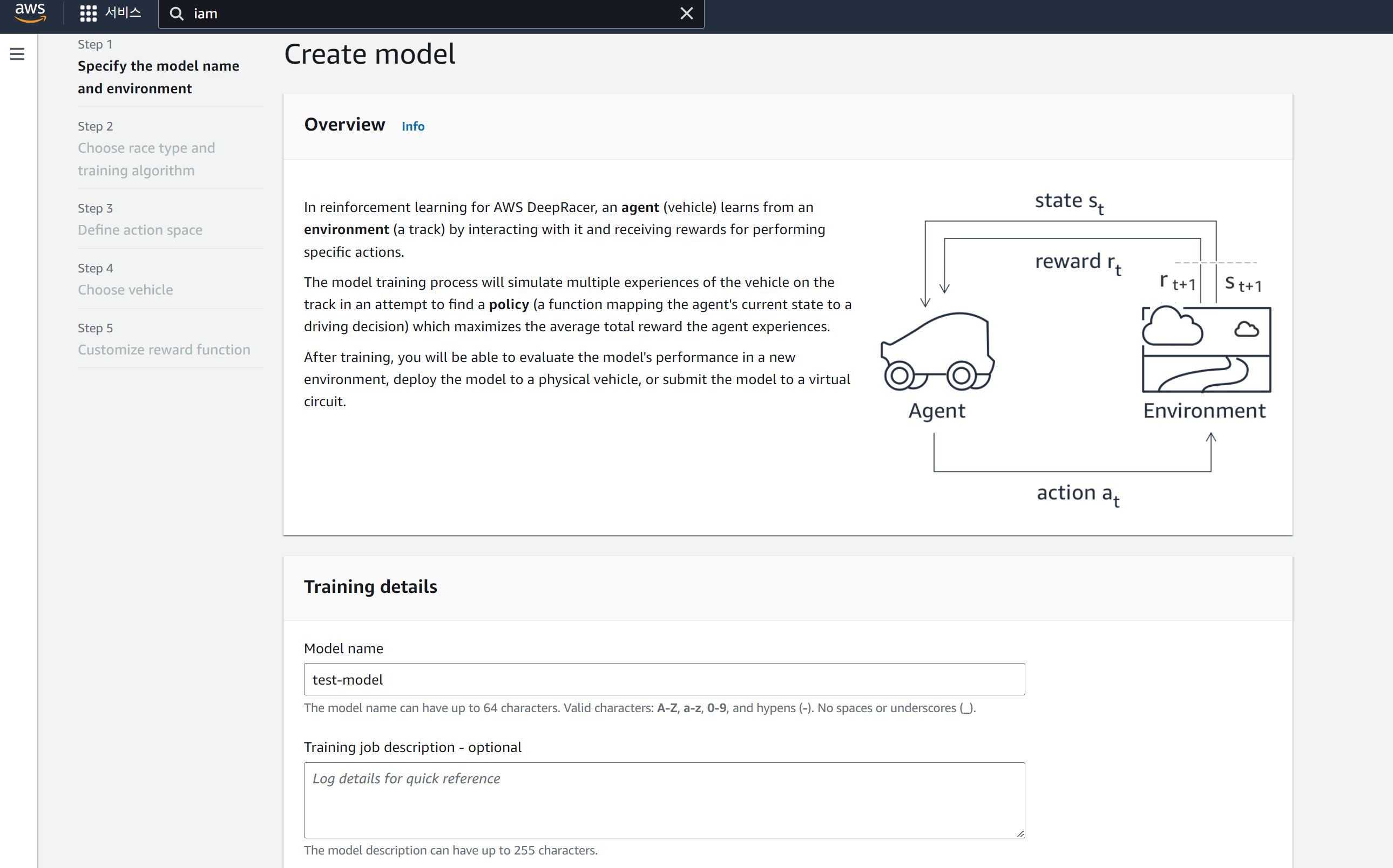 그거에 이어서 AWS 콘솔에서 실제 DeepRacer 서비스를 이용해보고, Vehicle과 Model을 생성하려한다.