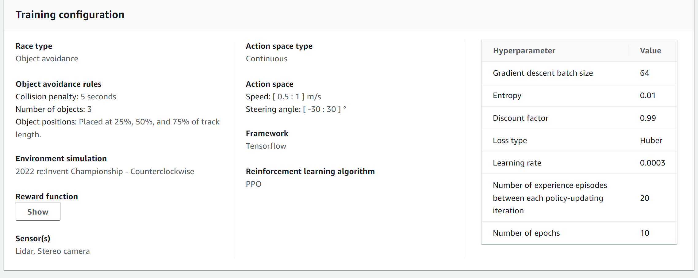 모델을 학습할 때에 고려할 값이다. 학습률, 보상 함수, 프레임워크, 강화 학습 알고리즘 등의 하이퍼파라미터를 적절하게 조정하여 성능을 향상시키는 것이 중요하다.