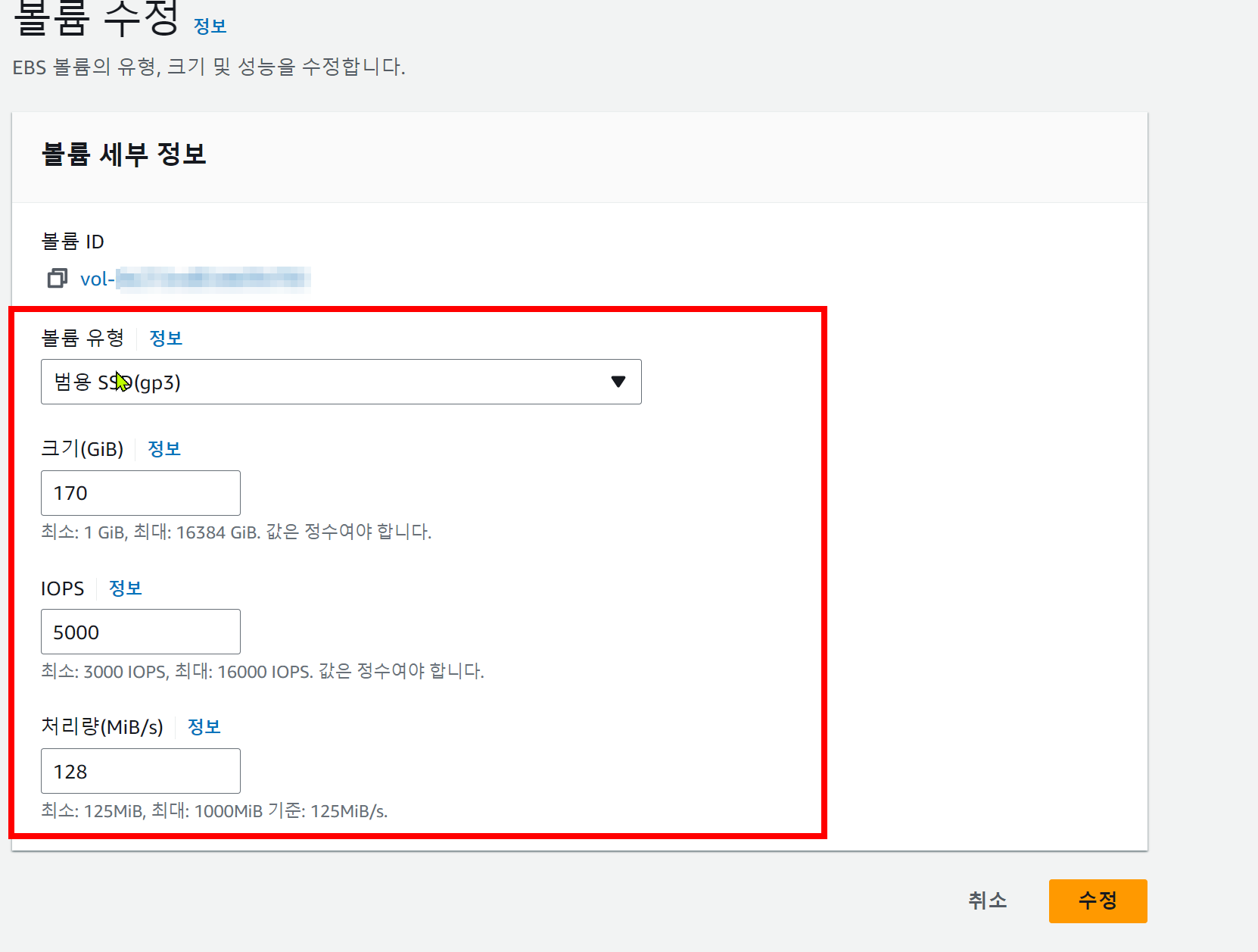 그러면 GP2 유형이 아닌 GP3 유형으로 변경 후, IOPS를 3000이상으로 변경이 필요하다.