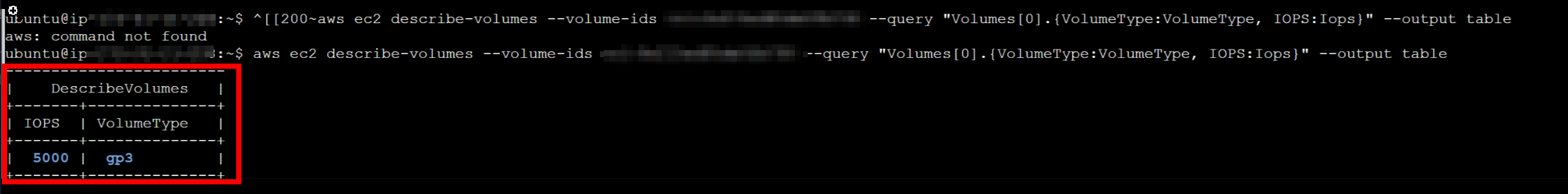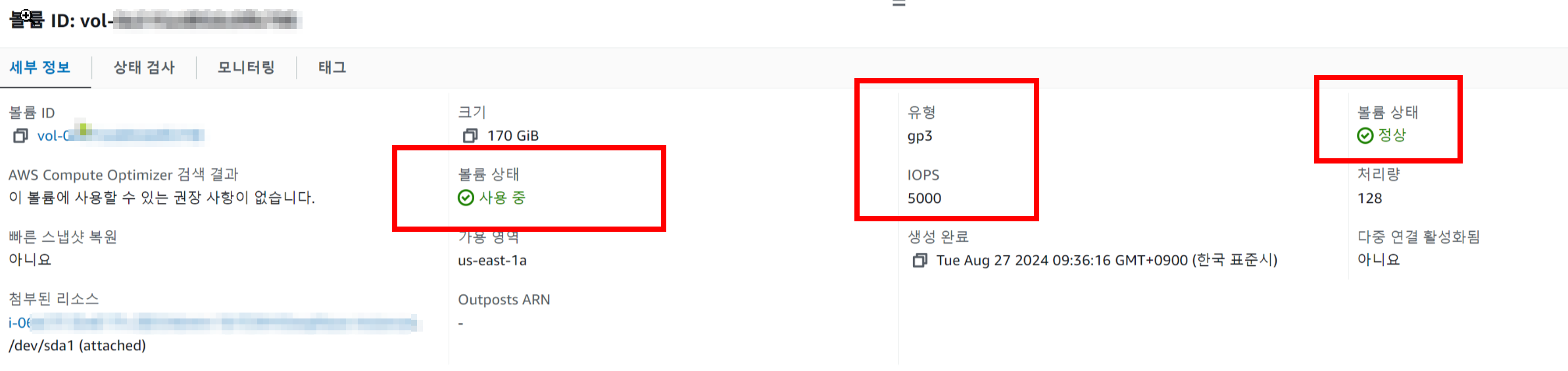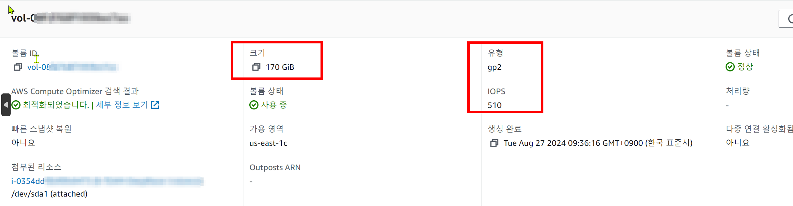 여기서 주의사항 ❗IOPS 값이 크면 EBS 볼륨이 수정되는데 Optimizing이라는 수치가 뜨며, 약 10분정도 시간이 소요된다.❗