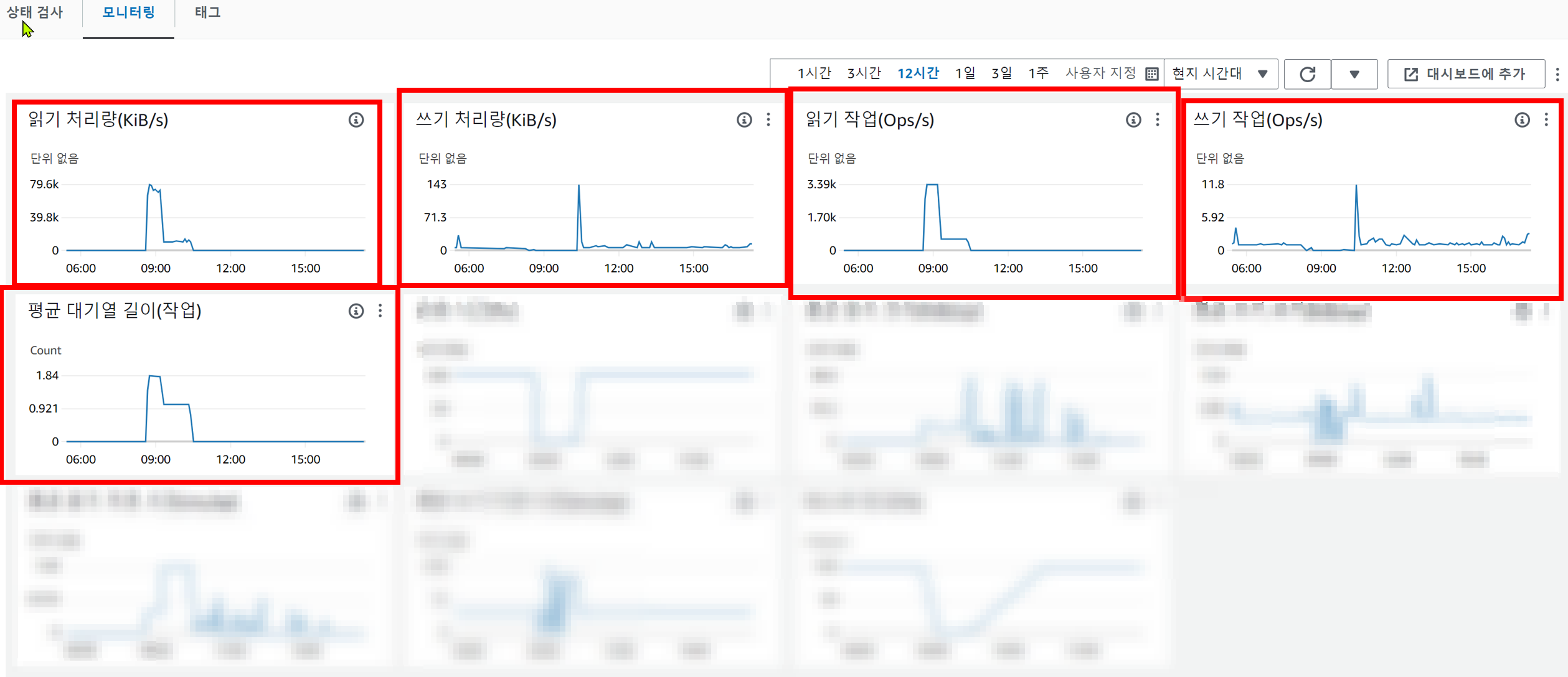 실제 서버에서 문제가 생겼을 시간에 경보시간에 쓰기/읽기가 갑작스럽게 Burst하는것이 확인된다.