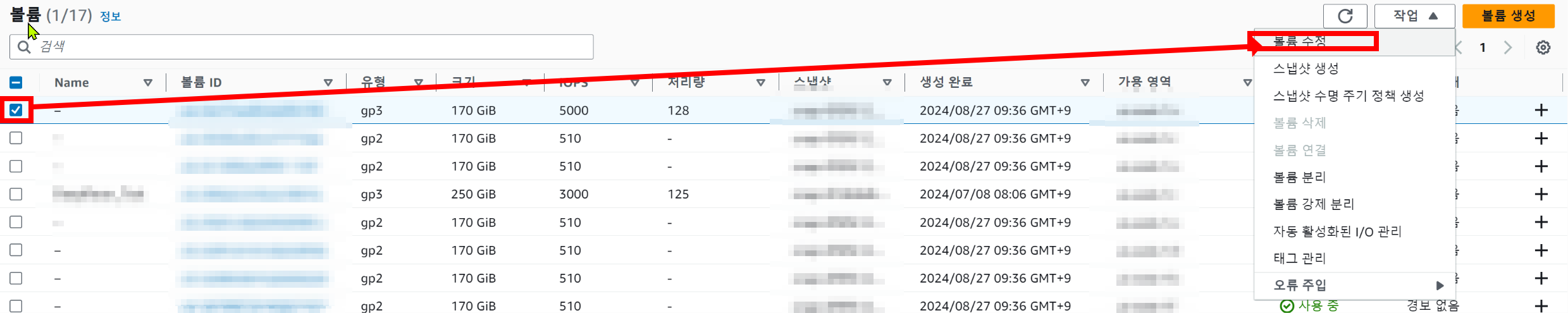 변경하고자 하는 볼륨을 선택 후, 볼륨수정으로 들어간다.