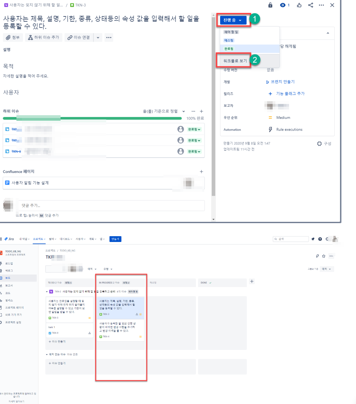 - 여기에서 이슈 키는 TKN-3 이며 이는 github 나 confluence, API 호출, 자동화를 통해 JIRA와 연동 때 필요.